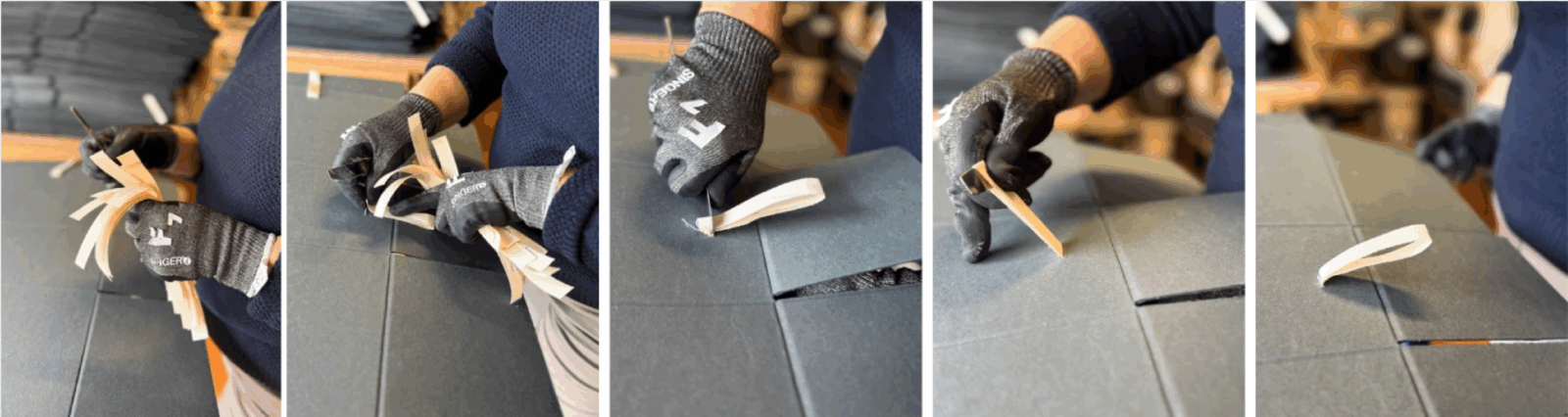 La teinte grise de ce carton, aussi précieuse que ce qu’il contient, vient de sa fabrication. « C’est sa couleur naturelle », explique Linda. Elle est obtenue à partir de cartons recyclés : « Ça vient simplement du mélange des encres. » Et les chutes de coupe ? Rien n’est perdu. Linda et Marie les collectent, les renvoient à l’entreprise qui les fabrique dans la Creuse, et elles les récupèrent ensuite sous forme de nouvelles plaques prêtes à plier. « La boucle est bouclée ! » sourit Linda.