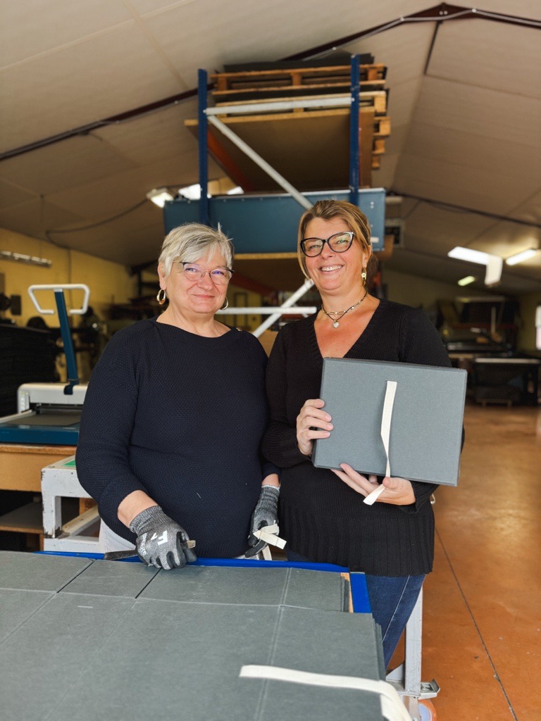 Après quelques mois d’arrêt, suite au rachat de l’entreprise autrefois connue sous le nom de Cartonnage de Ramadies, Linda et Marie ont repris le rythme. Elles s’affairent avec soin pour perpétuer, de manière traditionnelle et artisanale, ces boîtes en carton emblématiques de cet établissement historique.
