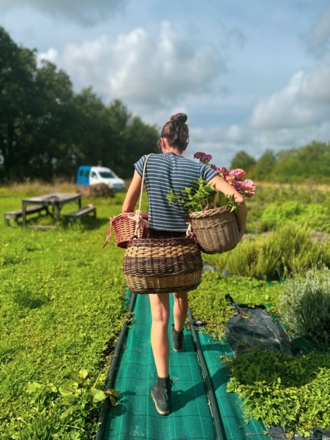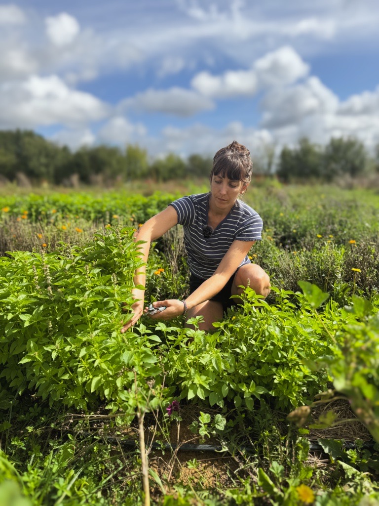 Installée depuis janvier 2024 à l’Essor Maraîcher, Capucine cultive une trentaine de variétés de plantes annuelles et pérennes. Sur sa parcelle de 700 m², basilic, sauge, cassissier, lavande et bien plus encore se mêlent en un véritable kaléidoscope de couleurs et de senteurs. Dans son atelier, elle transforme ses récoltes en macérats, tisanes, huiles, vinaigres ou sels aromatisés, chacun révélant le potentiel de la plante qu’il contient. “Feuilles, fleurs, racines, écorces… rien ne se perd!” sourit Capucine, qui pratique également la gemmothérapie, une branche de la phytothérapie qui utilise bourgeons, jeunes pousses et radicelles pour leurs bienfaits. Pour compléter son exploitation, Capucine n’hésite pas à s’aventurer dans la forêt, dans des espaces protégés ou sur des fermes bio pour pratiquer la cueillette sauvage, à la recherche d’ortie, de sureau, d’aubépine… et même de jeunes pousses de ronce.