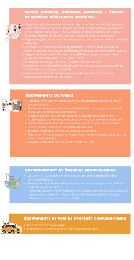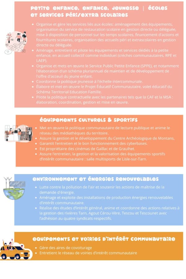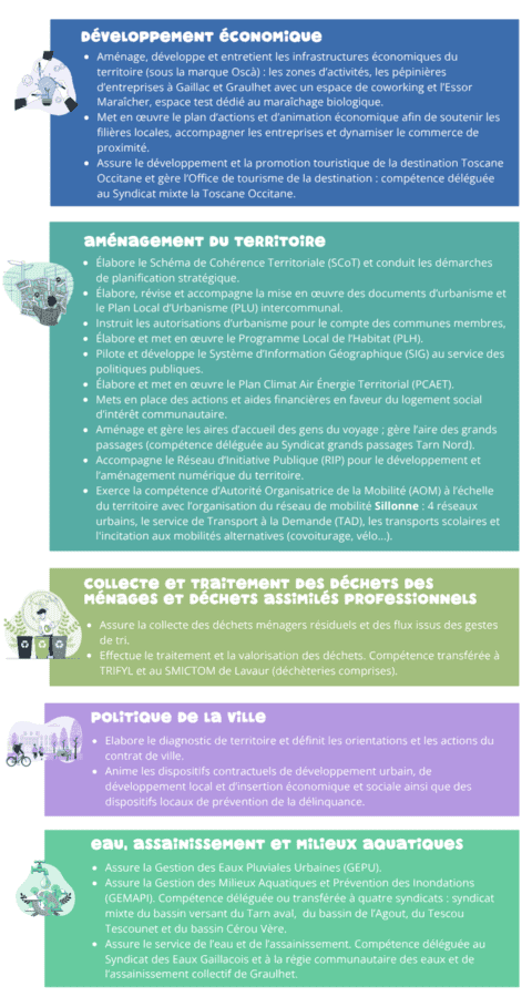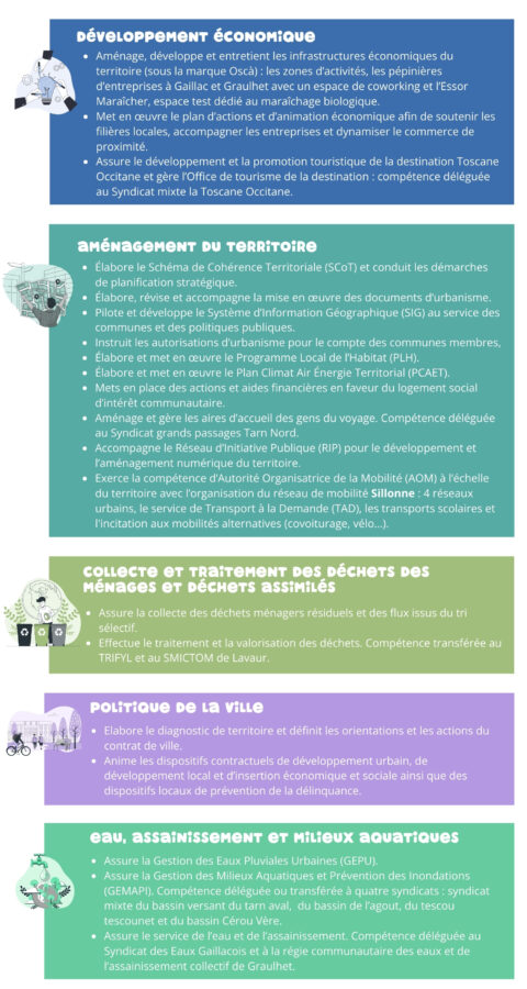 L’Agglomération intervient dans de nombreux domaines du quotidien. Ses compétences sont définies par la loi et par les choix des communes membres.On distingue :