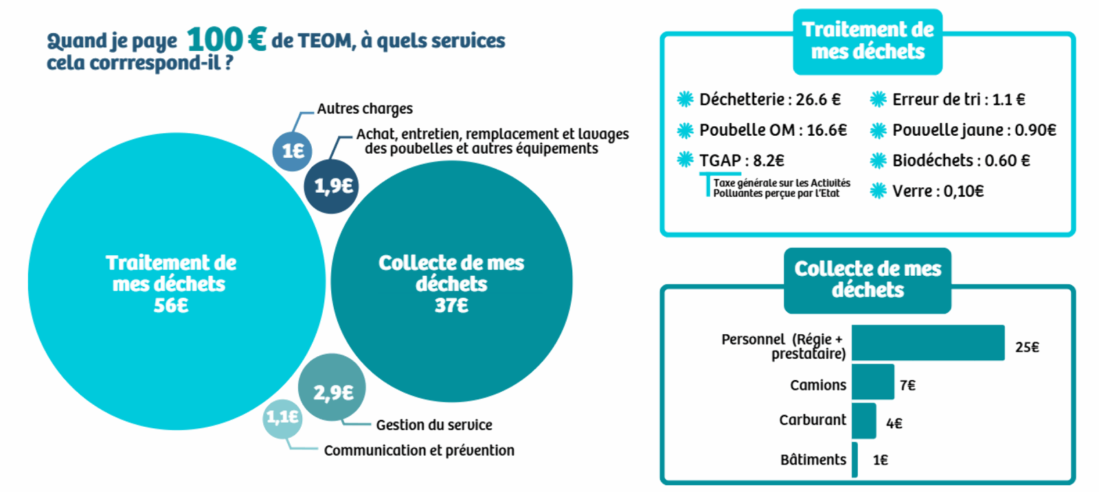 Lorsqu’un habitant paie 100 € de TEOM, cette somme finance la collecte et le traitement des déchets, la gestion du service, l’entretien des équipements, la communication et la prévention, mais aussi des taxes nationales, comme la TGAP, qui a fortement augmenté ces dernières années. Le coût du service déchets ne cesse de croître, notamment à cause du traitement et de ces taxes. Réduire sa production de déchets est aujourd’hui le principal levier pour limiter cette hausse et maîtriser le budget collectif.