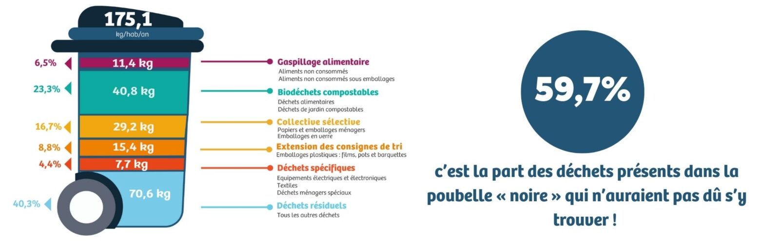 Les analyses montrent que 59.7 % des déchets jetés dans la poubelle « noire » n’y ont pas leur place. On y retrouve notamment des restes alimentaires qui pourraient être compostés, des aliments non consommés encore sous emballage, du papier et des emballages recyclables, ou encore du verre. Mieux trier ces déchets permet non seulement de limiter les erreurs de tri, mais aussi de réduire les coûts de traitement et l’impact environnemental.