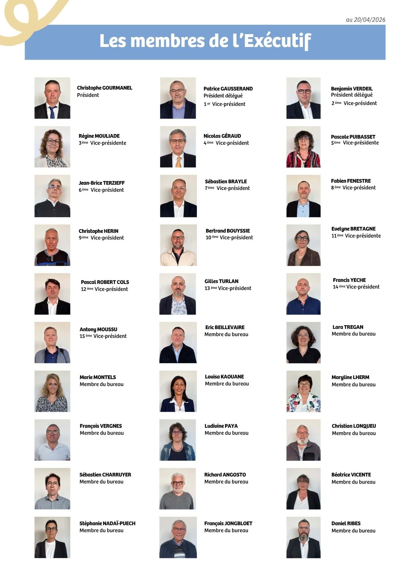 Aussi, j’ai l’honneur de vous transmettre, ci-dessous, la liste des élus composant l’exécutif communautaire pour la durée du mandat.