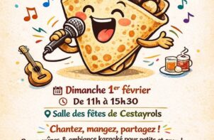 Karao'crêpes Lieu 81150 Cestayrols Horaire 11H00 à 15H30 Venez passer une journée riche en musique où vous aurez l'occasion de vous découvrir des talents de chanteur. Des crêpes vous seront proposées. Organisé par "Grandir ensemble". En savoir plus Du 01 Fév.