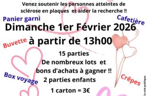Loto de la Saint Valentin Lieu Route des stades 81600 Brens Venez tenter de gagner l'un des nombreux lots qui seront proposés lors de ce loto qui permettra de soutenir les personnes atteintes de sclérose en plaques en aidant la recherche. En savoir plus Du 01 Fév.