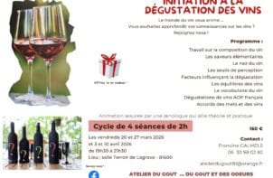Stage d'initiation à la dégustation des vins Lieu 63 chemin de la Bouissounade 81150 Lagrave Horaire 19H30 à 21H30 En 4 séances successives, plongez vous dans le monde du vin et initiez vous à la pratique de la dégustation des vins en compagnie d'une œnologue passionnée! En savoir plus Du 20 Mar. au 10 Avr.