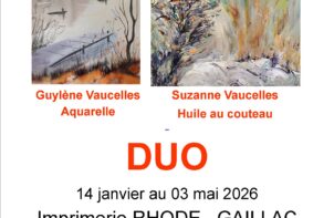 Exposition : "Duo" Lieu 79 Ave Charles de Gaulles 81600 Gaillac Horaire 00H00 Cette exposition présente les œuvres d’un duo mère fille. Elles vous offrent à partager un regard pour rêver. Ces dames proposent du mouvement, des ambiances. Elles Revisitent la réalité pour y placer de la lumière, de la gaité et des instants de liberté. En savoir plus Du 13 Jan. au 03 Mai.
