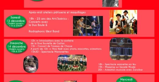 Le village de Noël c’est 15 chalets pour trouver des cadeaux, se restaurer et partager un verre. Tout le long de l’événement la place s’active autour de différentes animations et concerts. Le vendredi, inuaguration du village de Noël et concert avec Fred’accordéon. Samedi après, l’après-midi ateliers patisserie et maquillages, retrouvez en concert le duo Boule et Radiophonic West Bank. La journée du dimanche, le Père Noël sera présent à partir de 10h, à 15h30 il y aura un spectacle de marionnettes. À 13h assitez au concert de trompe de chasse. La journée se poursuit à 18h avec le spectacle majorette en feu, 19h un mapping illuminera la fçade du musée et pour finir à 20h animation musicale avec Zanzibar. Lundi à 19h DJ Jimmy proposera une animation musicale., à 20h il y aura une initiation au brasero. Le mardi à 19h concert de musiques de Noël. La journée du mercredi à 14h30 ateliers concours de dessins et fresque participative, à 19h30 la chorale de gospel Vocal Colors vous offrira une représentation.
