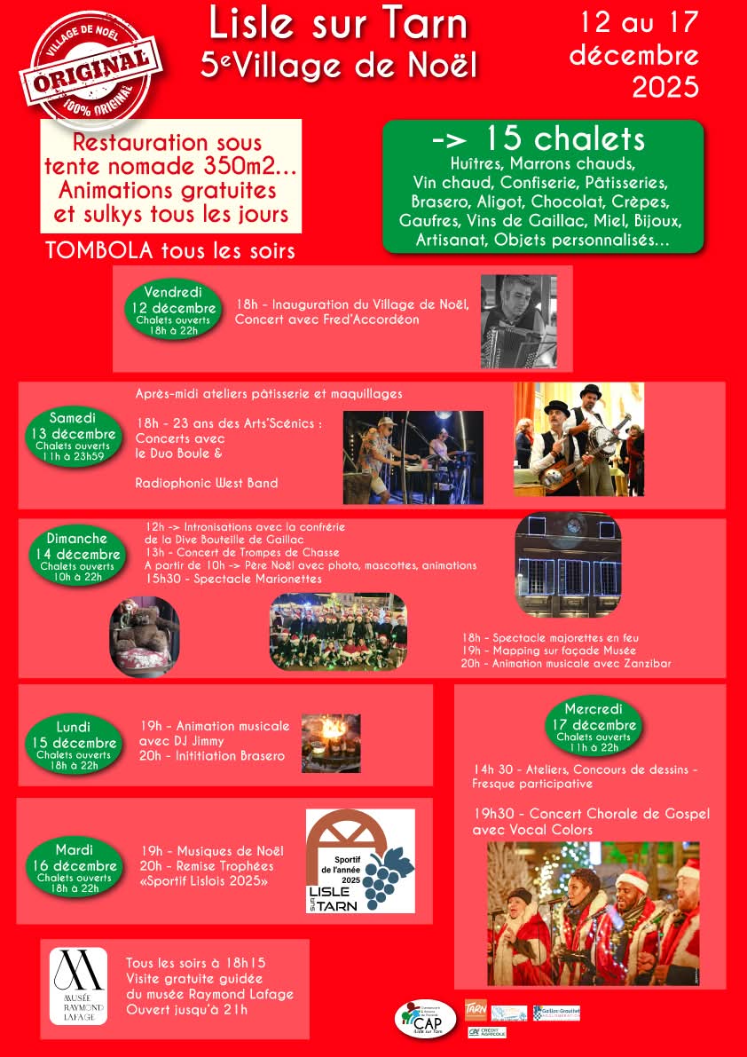 Le Village de Noël proposera une ambiance chaleureuse regroupant artisans, créateurs et producteurs du territoire. Vins de Gaillac, douceurs locales, objets artisanaux et idées cadeaux vous attendent dans une ambiance conviviale.