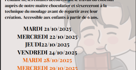 Pendant une heure, les enfants découvrent l’art du chocolat aux côtés de notre maître chocolatier. Ils s’initient à la technique du moulage et repartent avec leur propre création. L’atelier est accessible dès 6 ans.