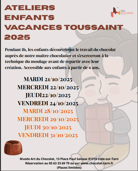 Au Musée Art du Chocolat à Lisle-sur-Tarn et comme chaque vacances scolaires, nous proposons des ateliers chocolat pour les enfants.