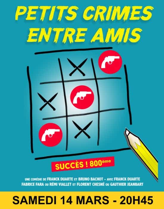 Un véritable ami est celui qui vous aide dans toutes les situations… même les plus extrêmes. Du moins, c’est ce qu’on dit. Mais que se passe-t-il lorsque l’on met cette règle à l’épreuve ? Au cœur des années 80, trois amis d’enfance se retrouvent pour une soirée qui va rapidement déraper. Les révélations s’enchaînent, les secrets refont surface et l’amitié vacille face à des situations de plus en plus inattendues. Entre humour, tension et rebondissements, Petits crimes entre amis est une comédie rythmée et pleine de surprises, qui jongle habilement entre rire et intrigue. Un spectacle écrit par Franck Duarte, mis en scène par Bruno Bachot, avec Rémi Couturier, Franck Duarte et Florent Chesné.