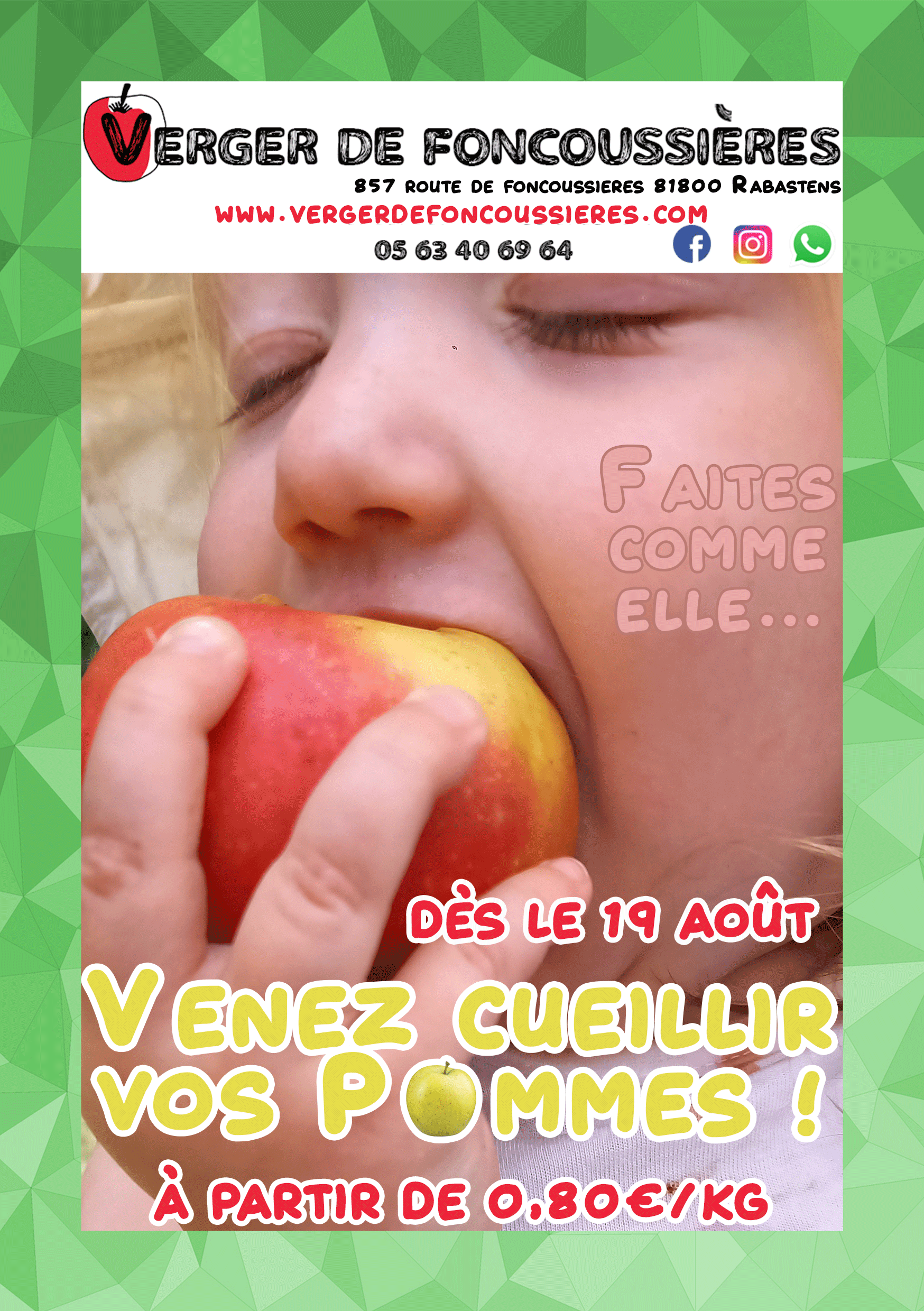 Venez cueillir vos pommes d’août à novembre au Verger à partir de 0.80€/kg ! La cueillette 2025 commence le 19 août avec les délicieuses Gala et Crunch Golden, Fuji, Chanteclerc, Granny Smith, Braeburn, Opal (bio), Galiwa (bio), Ladina (bio), Crimson, Goldrush (bio), Red Winter, Pitchounette, Ariane (bio), Canada grise, Smeralda (bio), Bertanne, Dalinette (bio), Tentation, Petite julie, Story (bio), Goldy, suivront. La cueillette de pommes est à partir de 0.80€/kg et 1.60€/kg pour les BIO Nos pommes sont cultivées en agriculture raisonnée et biologique. Retrouvez également toutes nos pommes à partir d’1.30€kg dans notre magasin fermier de produits locaux, accompagnées de plein d’autres produits locaux : fruits, légumes, viandes, œufs, produits laitiers, gâteaux, miels, confitures, jus, vins, bières, fromages, plats cuisinés, conserves etc. Pour connaître les variétés disponibles à la cueillette et en magasin, suivez-nous sur les réseaux sociaux Facebook et Instagram ou sur notre site internet www.vergerdefoncoussieres.com Pensez à amener vos paniers ! Le magasin et la cueillette sont ouverts tous les jours de 9h à 19h. Bonne cueillette !
