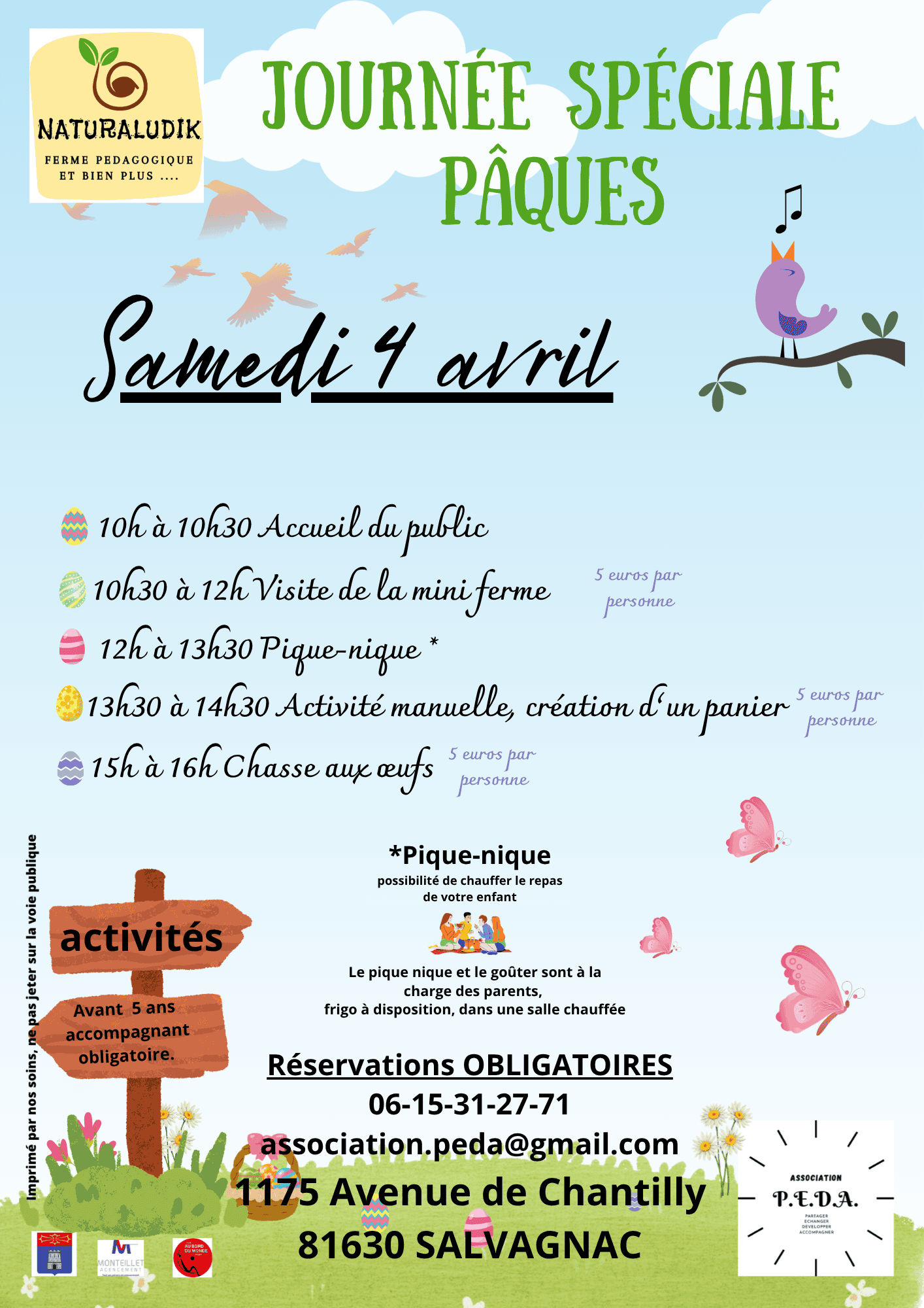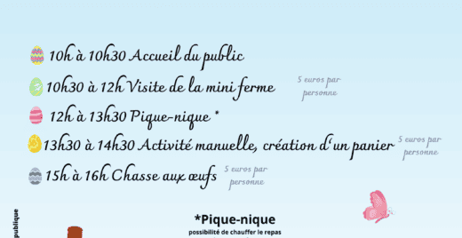 10h à 10h30 : accueil du public 10h30 à 12h : visite de la ferme 12h à 13h30 : Pique-nique (à charge des parents, frigo à disposition, possibilité de chauffer le plat de votre enfant) 13h30 à 14h30 : activité manuelle : création d’un panier 15h à 16h : chasse aux œufs Avant 5 ans, accompagnant obligatoire.