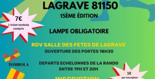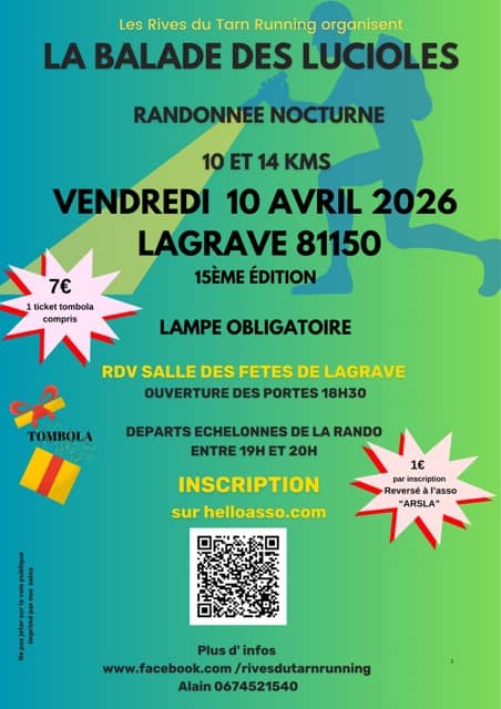 Participez à une randonnée pédestre nocturne conviviale de 10 et 14 km organisée par l’association Les Rives du Tarn Running .Pour préserver l’esprit familial de l’événement, le nombre de participants est limité à 700. Sur réservation.