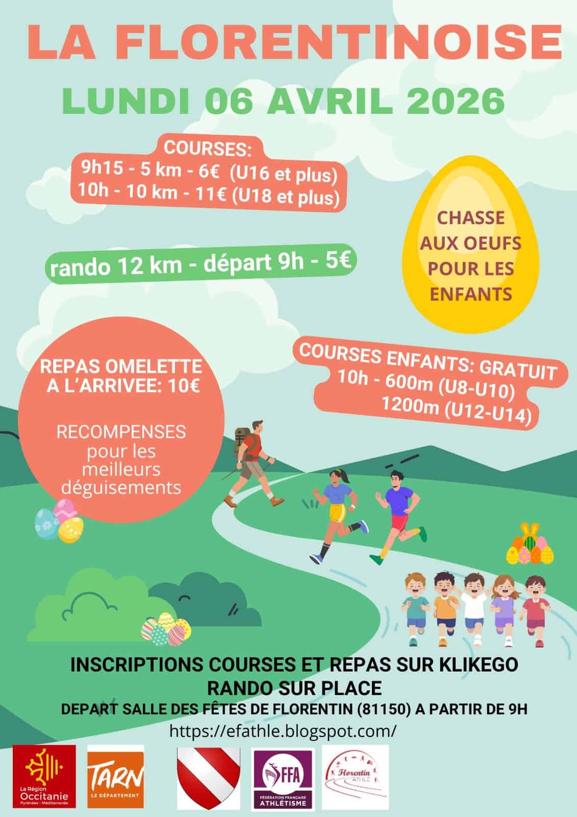 La Florentinoise vous propose une matinée sportive avec plusieurs départs échelonnés : 9h00 : rando 12 km (sans classement) 9h15 : course nature 5 km 10h : course nature 10 km 10h : courses enfants 600 m et 1200 m (inscriptions sur place)