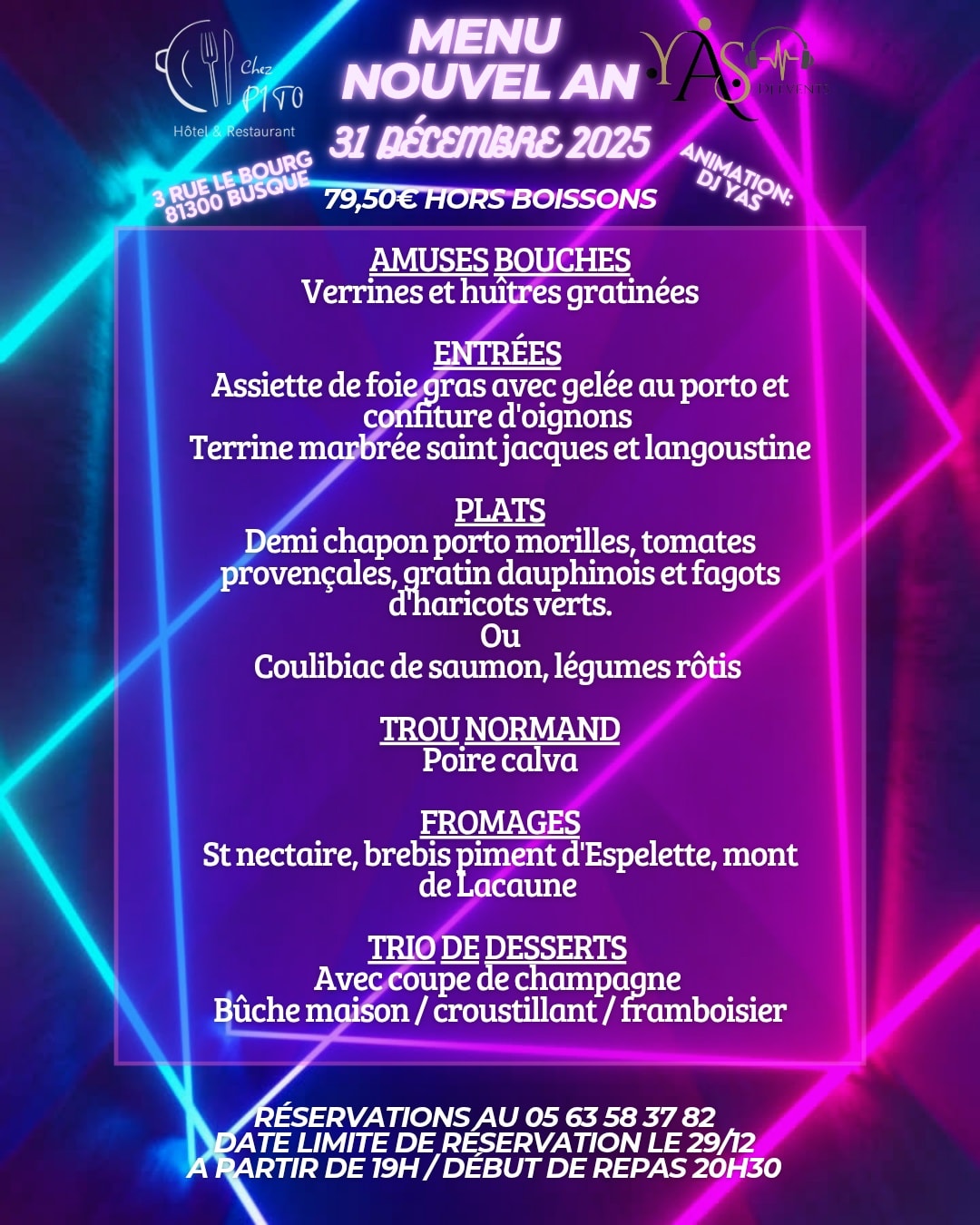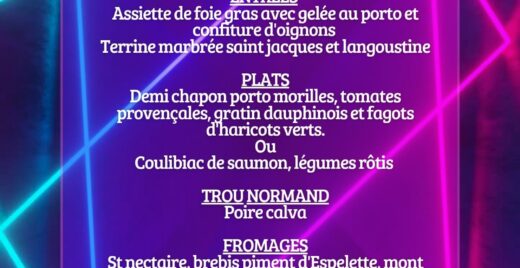 Amuses Bouches: Verrines et huîtres gratinées Entrées: Assiette de foie gras avec gelée au porto et confiture d’oignons Terrine marbrée saint jacques et langoustine Plats: Demi chapon porto morilles, tomates provençales, gratin dauphinois et fagots d’haricots verts. Ou coulibiac de saumon, légumes rôtis Trou normand: Poire calva Fromages: Saint nectaire, brebis piment d’Espelette, mont de Lacaune Trio de desserts: Avec coupe de champagne, bûche maison, croustillant, framboisier.