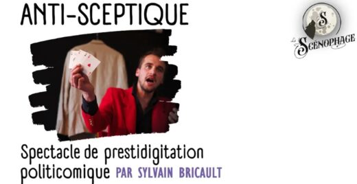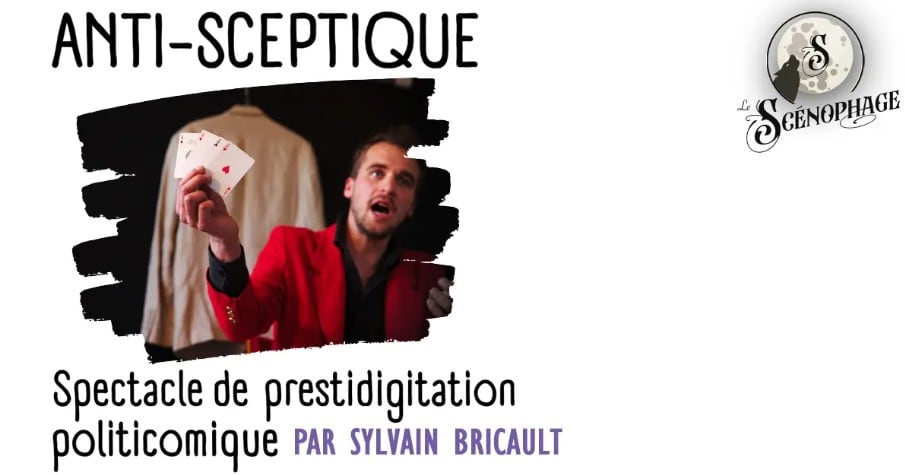 Anti-Sceptique est un spectacle de prestidigitation "politicomique" mêlant magie et théâtre. Avec humour et ironie, Sylvain Bricault joue avec la manipulation, détourne notre attention… et fait surtout rire, tout en secouant les esprits.