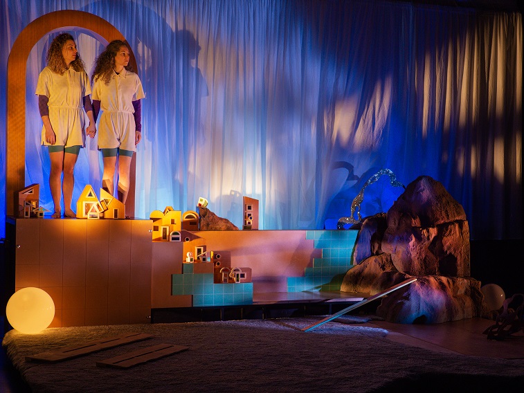 Une immersion poétique qui guide chacun sur le chemin de l’expression. Ici, tout paraît serein. Sur le plateau, une forêt, une montagne, un village et une rivière échangent des dialogues. Les enfants en pleine construction et les adultes dans leurs maisons, au cœur de l’été, s’adonnent à leurs activités. Cependant, si l’on observe attentivement, entre les arbres et sous un ciel étrangement azur, les maisons respirent et murmurent. Progressivement, l’univers familier se métamorphose en un espace intérieur. Corps-maison, corps paysage, corps-territoire : en habitant le décor, les deux interprètes font vivre simultanément le monde extérieur et celui intérieur. Les murs possèdent une bouche et la peau dénombre ses portes. Un secret se transforme en murmure, le murmure en rumeur… La rumeur devient parole libérée. Ou comment exprimer l’identité, l’intime et les frontières de manière sensible.