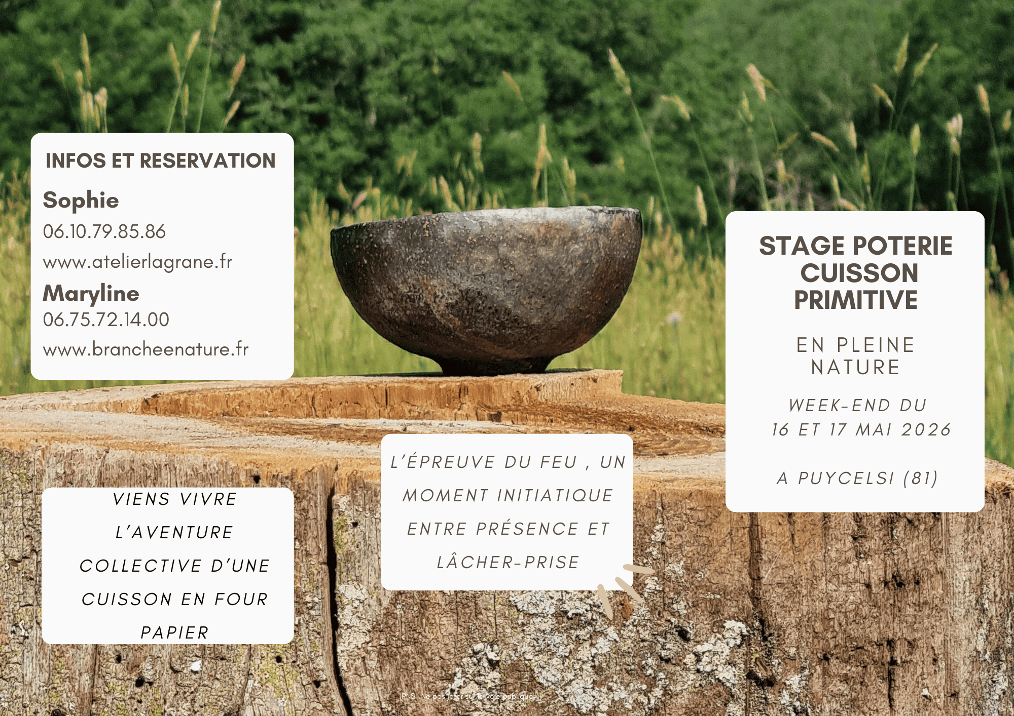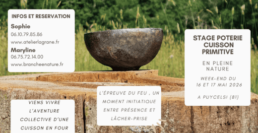 Ce stage de poterie en cuisson primitive et de ressourcement se déroule sur un week-end de deux jours, en pleine nature. Il propose une immersion au cœur des éléments — la terre, le feu, l’air et la nuit — dans un cadre propice au ralentissement et à la présence à soi. Le premier jour est consacré à la construction collective d’un four papier et à l’apprentissage des bases de la cuisson au bois. Chacun·e est invité·e à comprendre les gestes, à observer le feu, à ajuster, à patienter. La cuisson devient un temps fort, vivant et partagé, rythmé par la présence au corps, des méditations guidées, des lectures inspirantes et des expériences sensorielles en lien avec la nature environnante. La nuit se vit sur place, sous tente ou à la belle étoile, dans une atmosphère simple et conviviale, laissant au feu le temps de faire son œuvre. Le lendemain est dédié au défournement et à la découverte des pièces, moment souvent chargé d’émotions, où se révèlent les traces du feu, les surprises et la singularité de chaque création. Ce temps est accompagné d’espaces de partage et d’intégration de l’expérience vécue. Le stage se déroule en petits groupes, favorisant la qualité de présence, l’écoute et le respect du rythme de chacun·e. Aucune recherche de performance : l’essentiel est dans l’expérience, le lien aux éléments et le chemin parcouru. Pré-requis : apporter une pièce en argile sèche (non cuite), prête pour la cuisson.