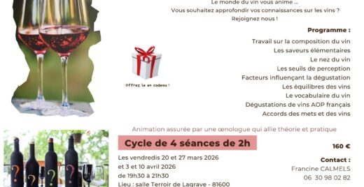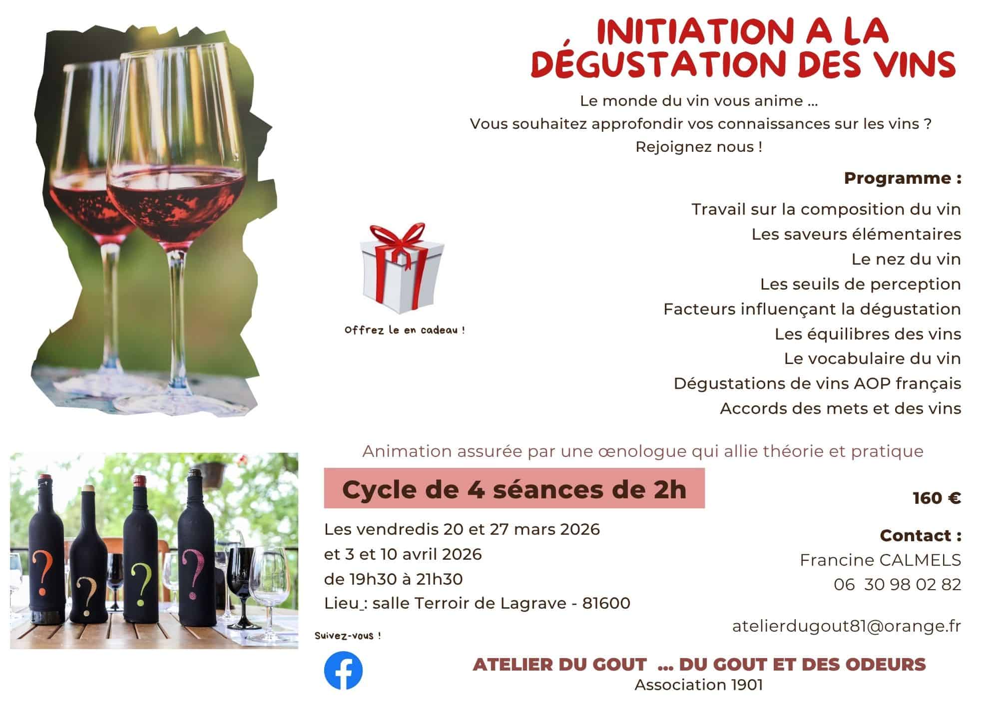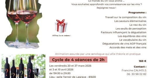 Apprenez les techniques de dégustation, travaillez la perception des saveurs élémentaires, découvrez les cépages et leurs caractéristiques aromatiques , sensibilisez vous aux équilibres des vins, dégustez à l’aveugle et commentez en compagnie d’une œnologue conseil les vins de France et les vins de Gaillac! Une belle idée cadeau ou pour une future reconversion dans le monde du vin! Possibilité de réaliser un BON CADEAU!