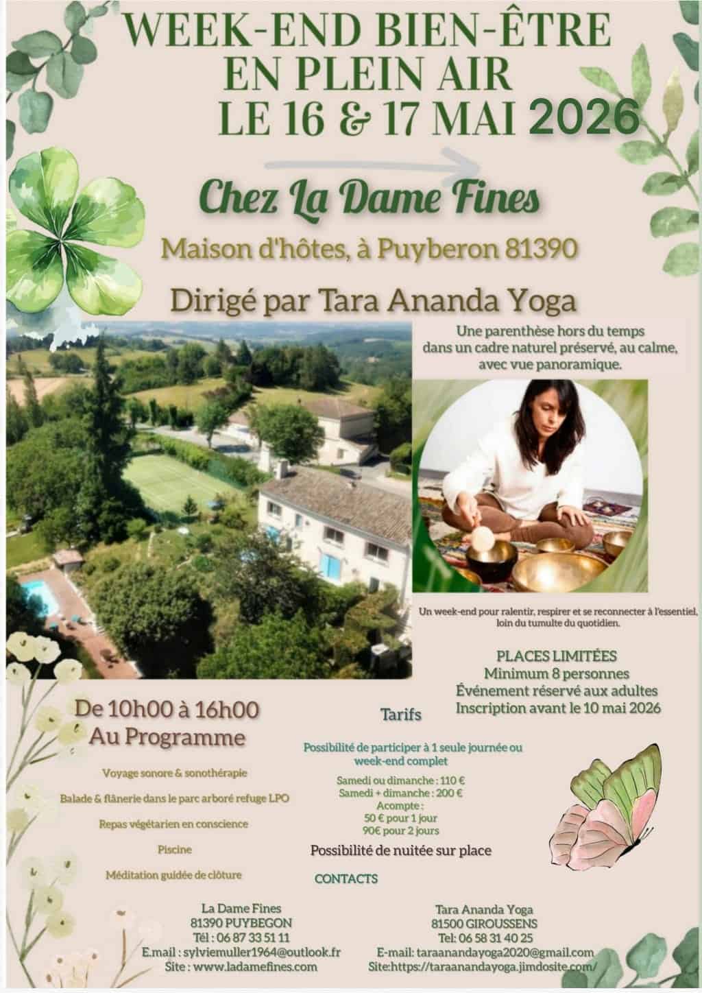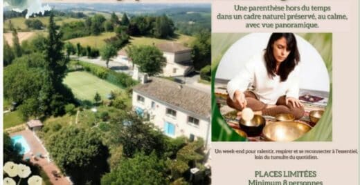 Voyage sonore & sonothérapie (apporte tapis de sol, petit cousin, plaid) Balade & flânerie dans le parc arboré refuge LPO (Ligue Protection des Oiseaux) Repas en conscience compris dans le prix ( végétarien) Piscine (apporter maillot et serviette de bain) Méditation guidée de clôture Possibilité de passer la nuit sur place en supplément